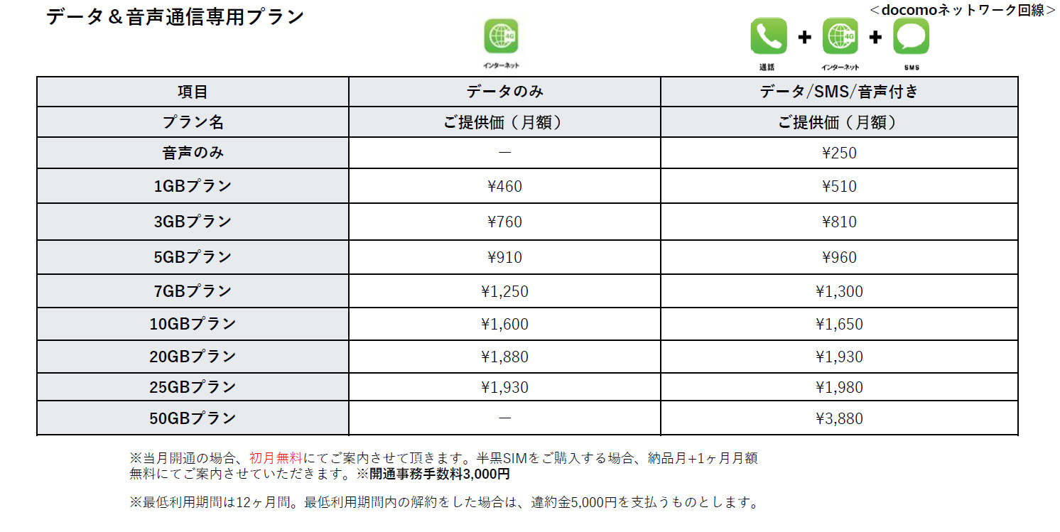 ※当月開通の場合、初月無料にてご案内させて頂きます。半黒SIMをご購入する場合、納品月+1ヶ月月額無料にてご案内させていただきます。